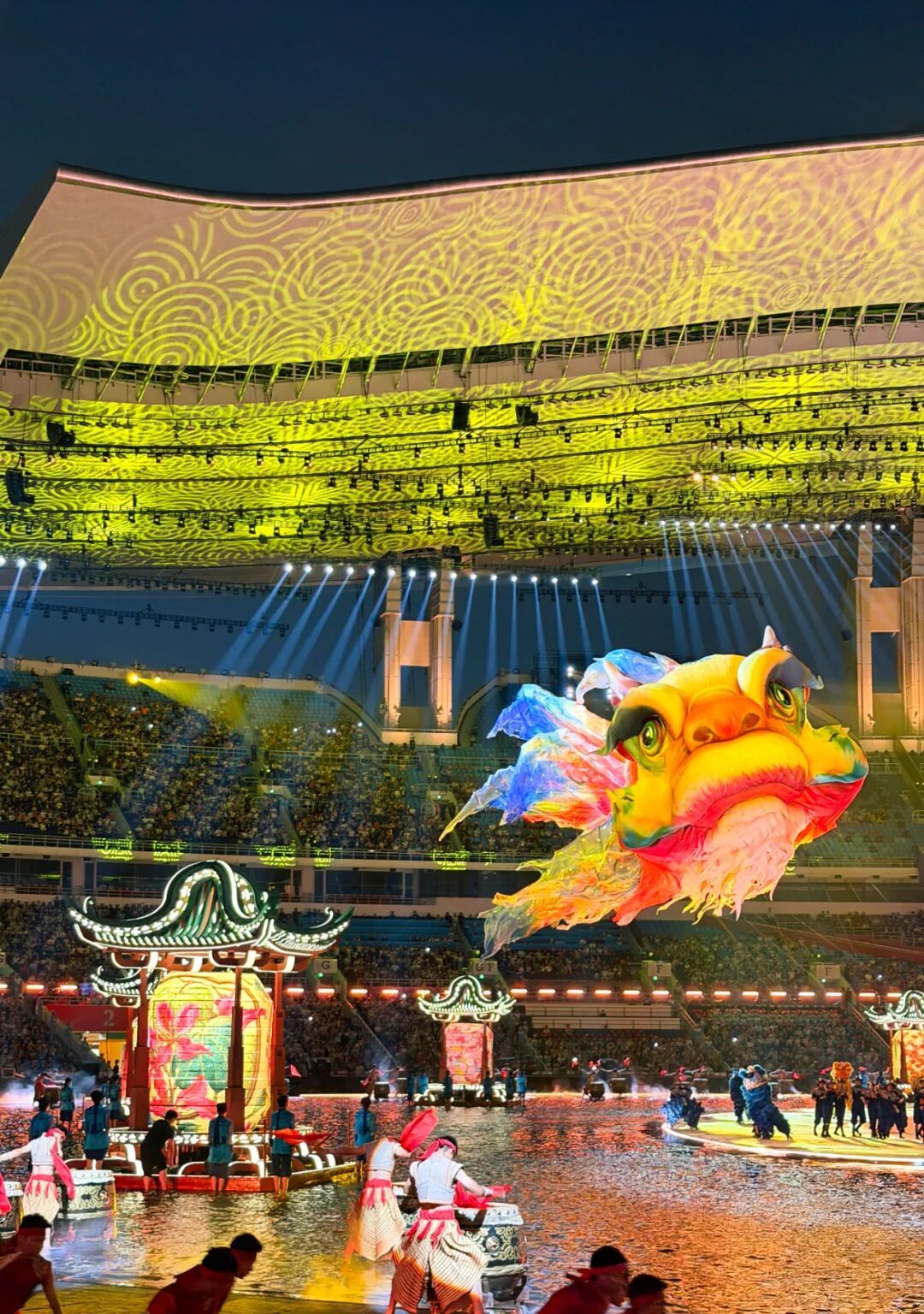 开幕式上最令人难忘的一幕,莫过于那只翱翔于天海之间的金色鳌鱼。庞大却不失轻盈,古老又充满未来感——它不仅是视觉奇观,更是一次对岭南文化的深情回眸。