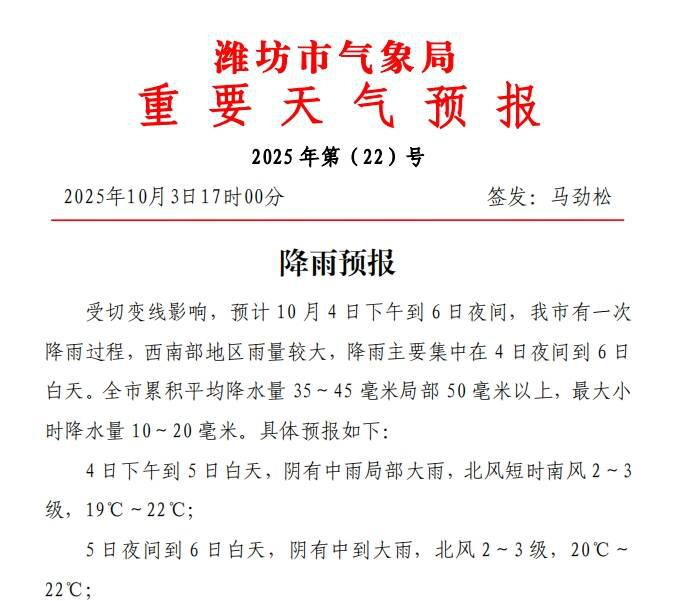具体预报如下:4日下午到5日白天,阴有中雨局部大雨,北风短时南风2~3级,19℃~22℃;5日夜间到6日白天,阴有中到大雨,北风2~3级,20℃~22℃;6日夜间,阴有小雨,北风2~3级,17℃~20℃。此次降雨过程以稳定性降水为主,整体雨势平缓,但降雨持续时间长,累积雨量较大,叠加前期降雨,需防范对秋收秋种、交通出行、旅游的不利影响和地质灾害、城市暴雨积涝、农田渍涝等次生灾害。